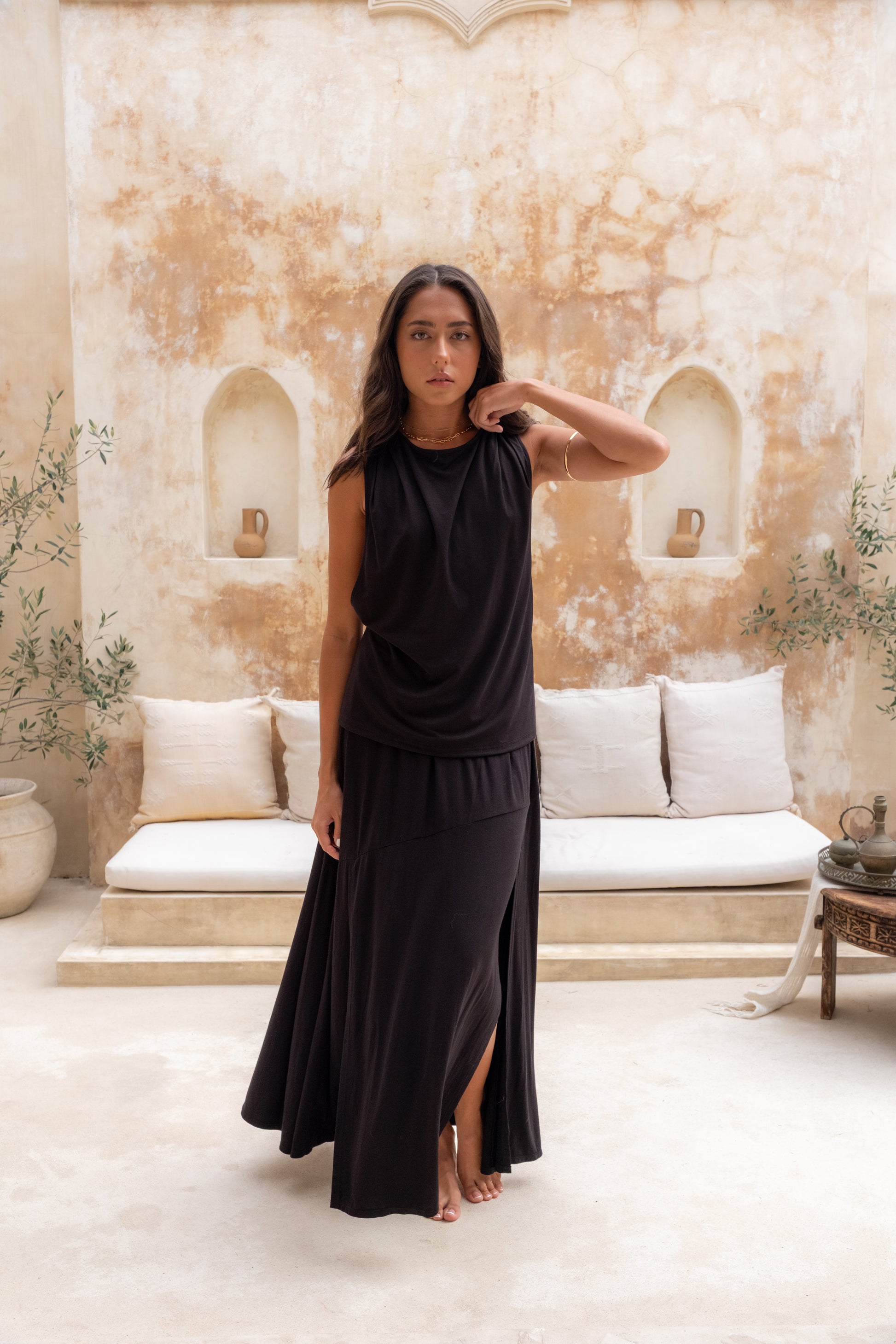 We wanted a top that felt like air on your skin but still carried shape and intention. Inspired by racerback active tops, the Elaine Tank was made for versatility — pair it on its own or with a bandeau of your choice - the Elaine can take you from the seriousness of the office, to the sultry-ness of the bars.